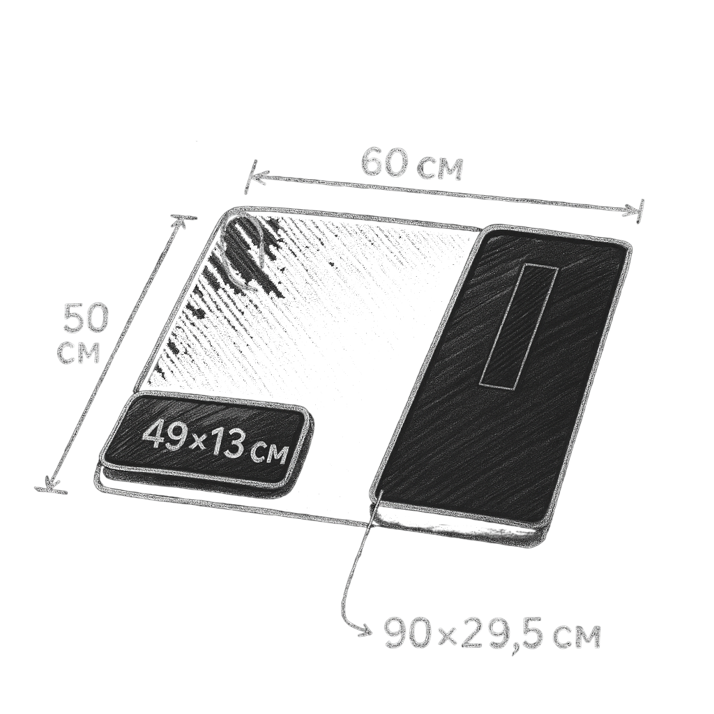 Mounting: Hook-and-loop (Velcro) strap module (90 × 29.5 cm) + tie straps via inner flap (49 × 13 cm); no drilling/adhesive.