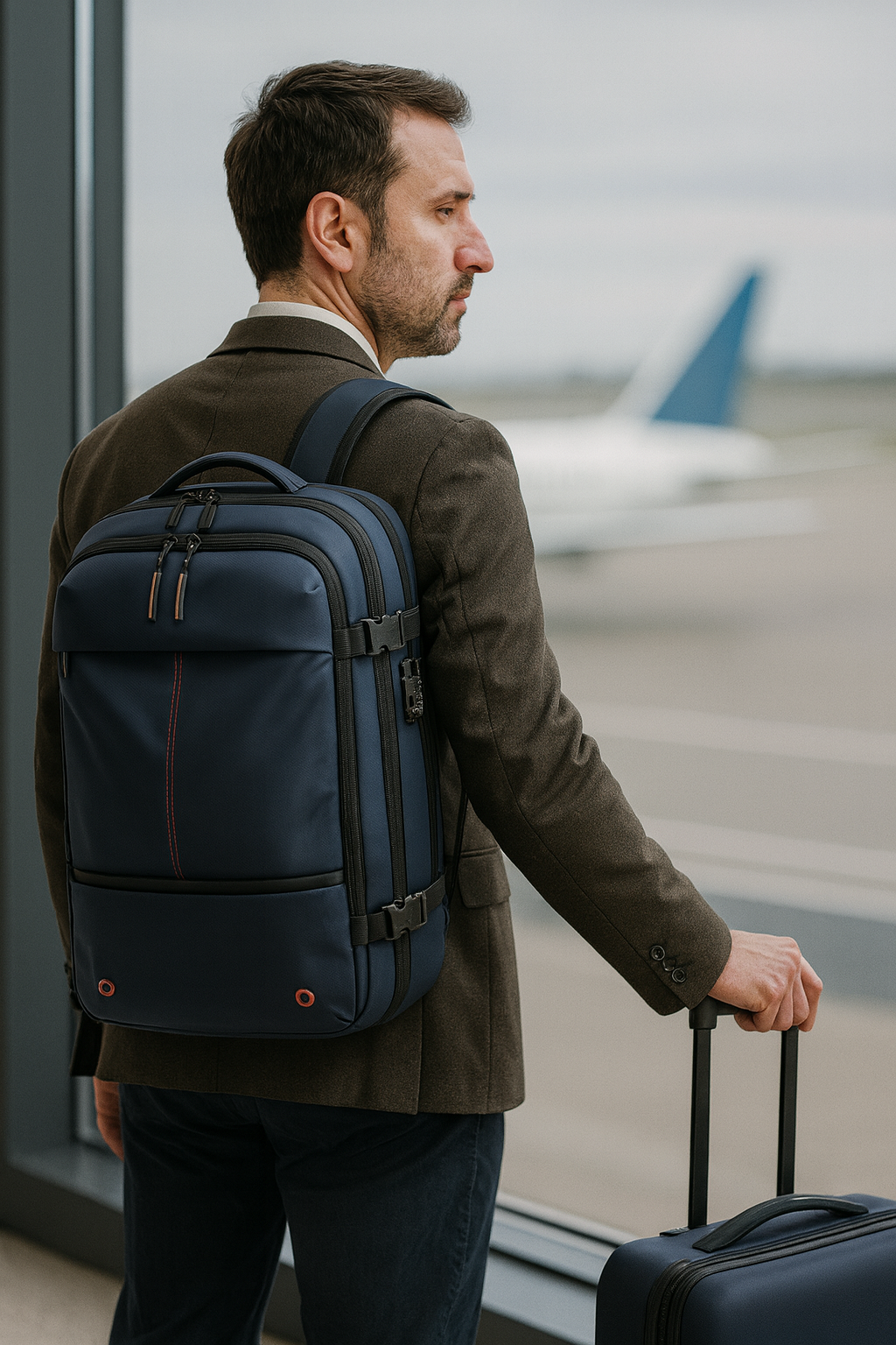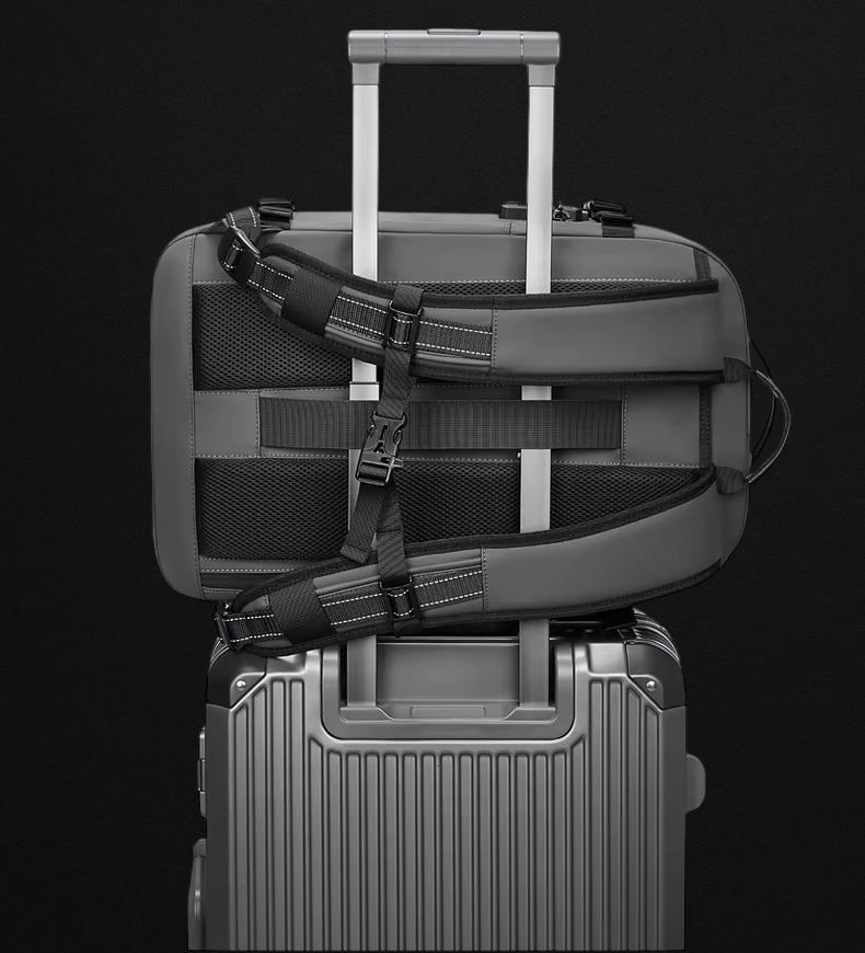 The built-in luggage strap securely slides over your suitcase handle, letting you move through airports with ease — no shoulder strain, no juggling bags.