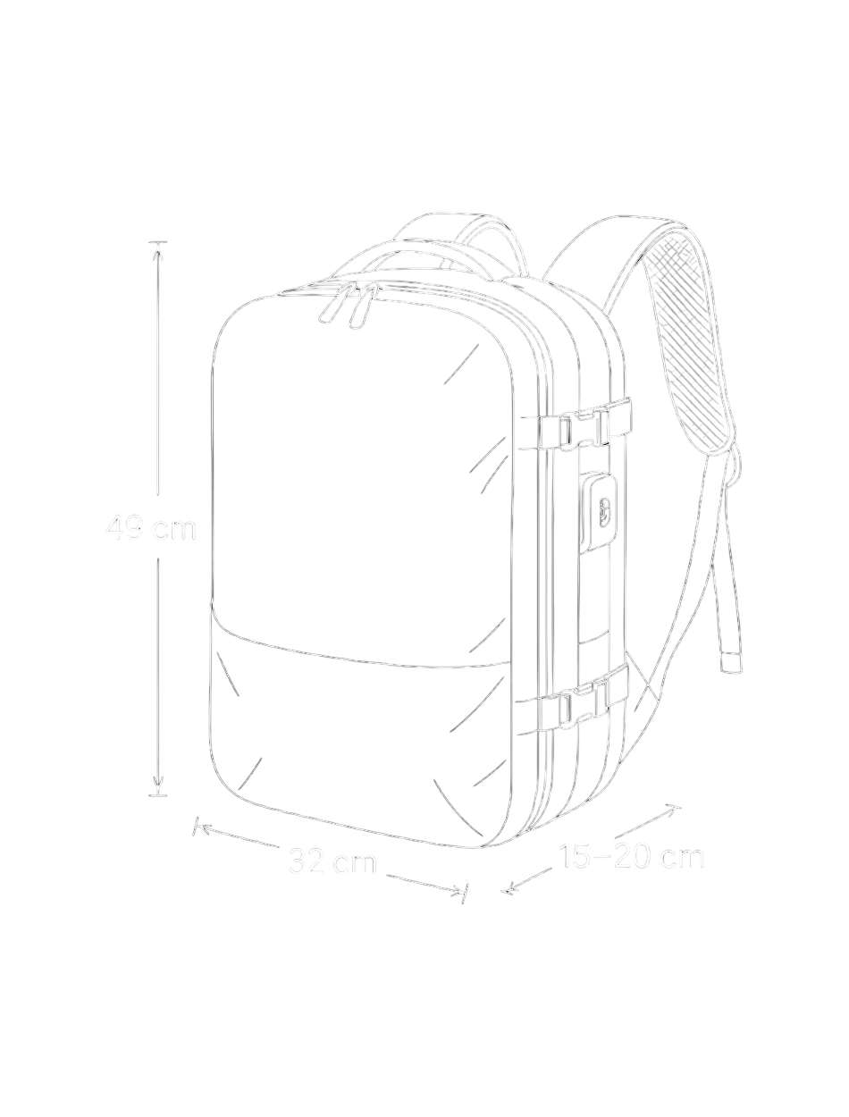 Thanks to its built-in vacuum system, the backpack expands up to 20 cm and compresses back to 15 cm — so you can carry more and still travel light.